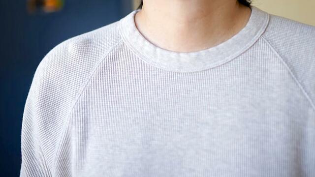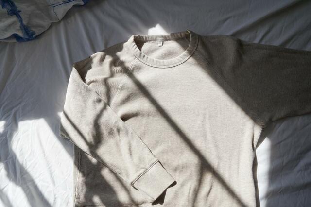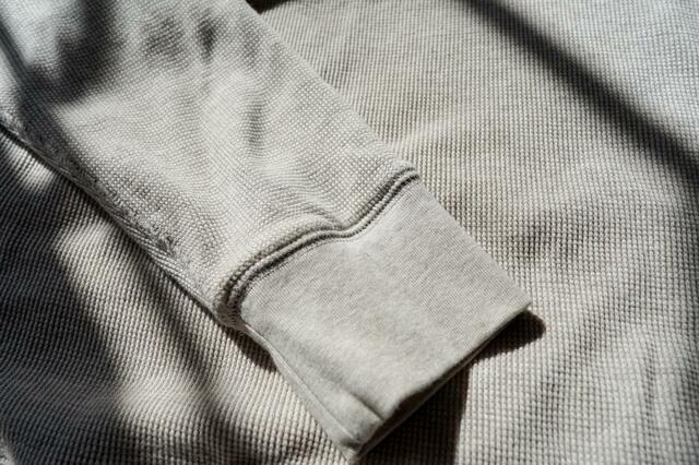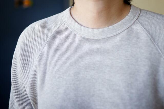 以前は、柔らかくてよく伸びる分、首元や袖口が洗濯を繰り返すと伸びやすいということがありましたが、今季は密度の高いワッフル地に変更。