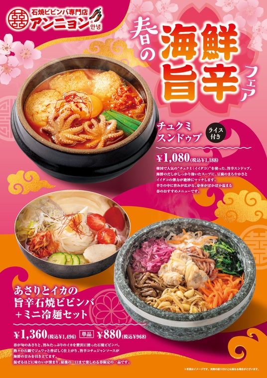 石焼ビビンバ専門店「アンニョン」では3月5日(木)より「春の海鮮旨辛フェア」を開催いたします。韓国で人気の“チュクミ(イイダコ)”を使用した旨辛スンドゥブに春の旬な海鮮食材・あさり、イカなどを使用した旨辛石焼ビビンバでございます。韓国の食のトレンドと旬な食材の美味しさをお楽しみください。また、3月19日(木)までフェアメニューご注文のお客様にソフトドリンク1杯無料キャンペーンも行います。※どうぞこの機会にご利用ください。皆さまのご来店をスタッフ一同お待ちしておりま