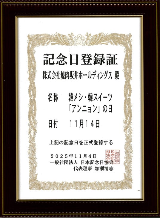 記念日名称:韓メシ・韓スイーツ 「アンニョン」の日 記念日日付:11月14日 正式登録日:2025年11月4日(火)「アンニョン」は1999年4月福岡県糟屋郡にて1号店をオープン