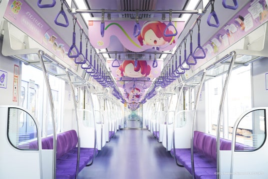 車両内では、『ぽこ あ ポケモン』に登場する「ニンゲンの姿にへんしんしたメタモン」がお出迎え。同作で楽しめる、個性豊かなポケモンたちとの生活を覗き見ることができます。