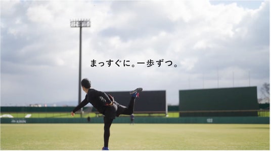 今回のCMでは、試合中の真剣な表情とは異なる、山本由伸選手が日々「トライ」している練習中の姿にフォーカスしています。「まっすぐに、一歩ずつ。」というメッセージのもと、グラウンド整備や基礎練習、ピッチングといった日々の積み重ねが、大きな舞台での活躍につながっていることを描いています。