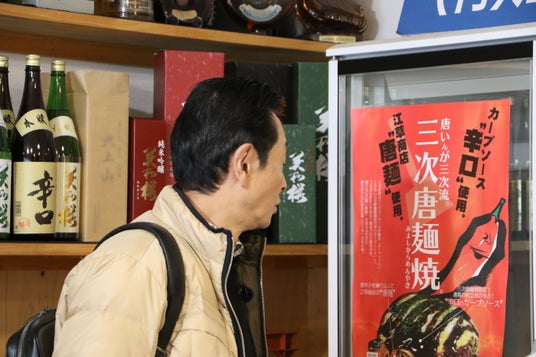 中国地方のほぼ中央に位置する三次市は、豊かな自然に恵まれた、歴史と文化が息づく町。ぶらり散策していると、「三次唐麺焼(みよしからめんやき)」「江草商店“唐麺”(からめん)使用」の文字を見つけます。詳しい話を伺うため【江草(えぐさ)商店】にお邪魔します。
