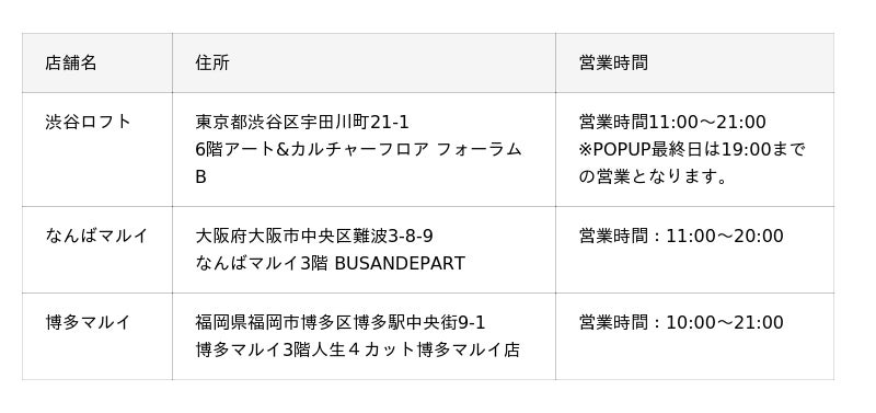 開催場所:渋谷ロフト・なんばマルイ・博多マルイ