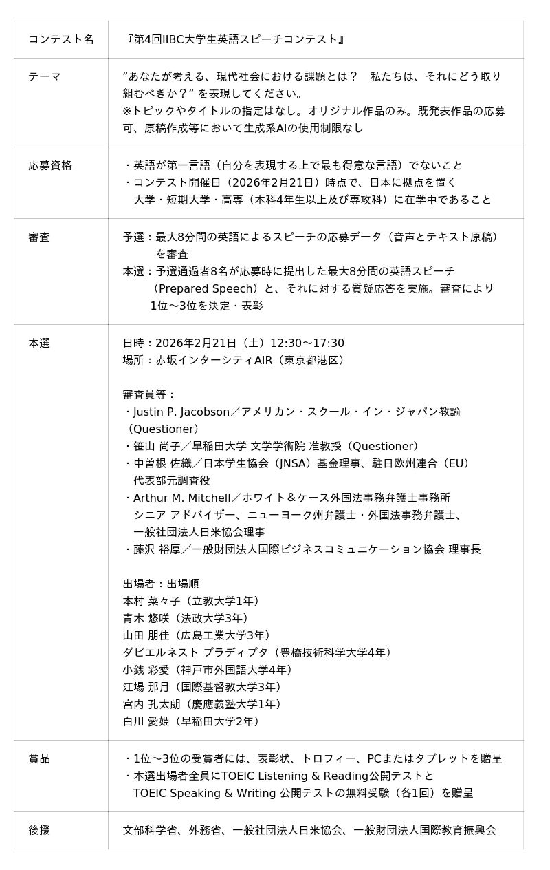 日本でTOEIC(R) Programを実施・運営する国際ビジネスコミュニケーション協会(IIBC)(所在地:東京都中野区中野、理事長:藤沢 裕厚)は、『第4回IIBC大学生英語スピーチコンテスト』を2026年2月21日(土)に赤坂インターシティAIRにて開催しました。応募者119名のうち、予選を通過した8名が本選に出場し、受賞者が決定しました。