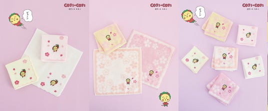 満開の桜の花の中で元気いっぱいに春の訪れを喜んでいるコジコジがアクセントになったタオルハンカチーフ。春の訪れを手元から、コジコジと一緒に楽しみませんか。