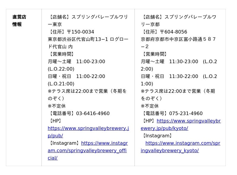 【参考】 スプリングバレーブルワリー株式会社 直営店情報