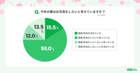全ての回答者を対象に「今年の春はお花見をしたいと考えているか」質問しました。最も多かったのは「開催/参加をしたいと思っている」で、59%でした。2位は「開催/参加を決めている」で15.5%となり、全体の74.5%が今年の春お花見をしたいと考えていることがわかりました。