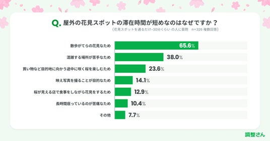 上記の質問で「30分くらい」「20分くらい」「10分くらい」「花見スポットを通るだけ」を選択した人が「屋外の花見スポットの滞在時間が短めな理由」について集計しました。複数回答形式で聞き取ると、「散歩がてらの花見なため」が65.6%となり、圧倒的な多さで1位となりました。2位は「混雑する場所が苦手なため」で38%でした。また「その他」を選んだ人の具体的な理由では「花粉症のため」が複数あったほか、「まだ寒いため」という回答も目立ちました。季節の風物詩であるお花見も、短時間でタイパ良く楽しむ人が一定数いることが示されました。