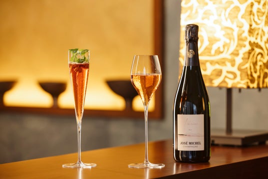 コースの始まりは、屋外のアペロスペースで春の息吹を感じながら楽しむアミューズから。ペアリングには、自然派ワインの生産者ジョゼ・ミッシェルによる、華やかなロゼ・シャンパーニュを用意。または、たっぷりの苺とミントをベースにした軽やかなモクテル(*2)も選べます。透明感あるピンク色と、はじける泡が、高揚感あふれるディナーの幕開けを華麗に彩ります。