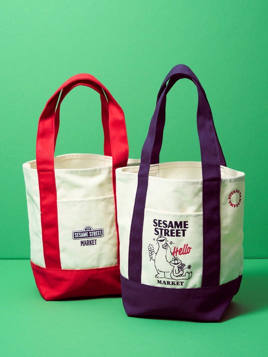 お花を手にしながら遊ぶエルモとクッキーモンスターのアートをあしらったトートバッグ。シンプルながらもバイカラーがアクセントになったデザインとしっかりした素材感で、シーンを選ばず気軽にお使いいただけます。使わないときは折りたたんで持ち運べるため、バッグの中でもかさばりにくいのがポイント。