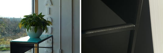 (左)目を引くミントグリーンカラーの天板 (右)「ハンマートーン塗装」を施したフレーム
