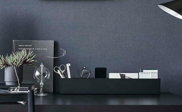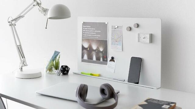 スチールパネルの下にはフチ付きのトレーがあり、ペンや小物を収納したり、タブレットやスマートフォンを立て掛けておくこともできちゃいますよ。