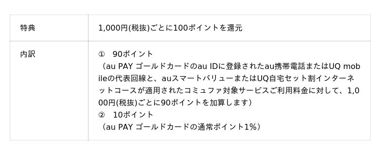 コミュファ対象サービスに加入いただき、au PAY ゴールドカードでコミュファご利用料金のお支払い設定を完了し各種条件を達成すると最大3ヵ月分の10%特典還元を受けられます。