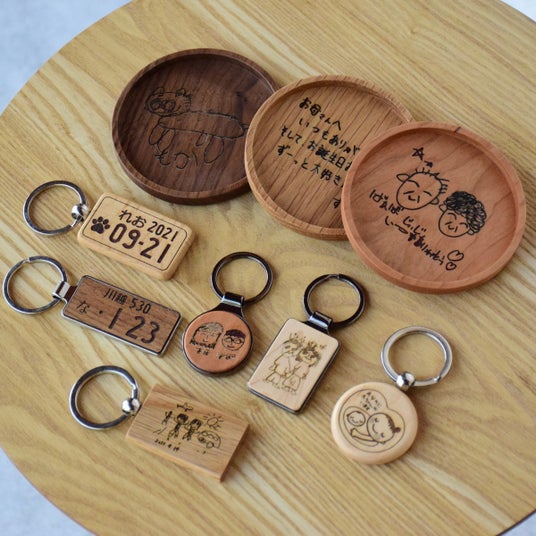 レーザー彫刻技術を用い、その場で描いたイラストをキーホルダーやコースターに刻印。