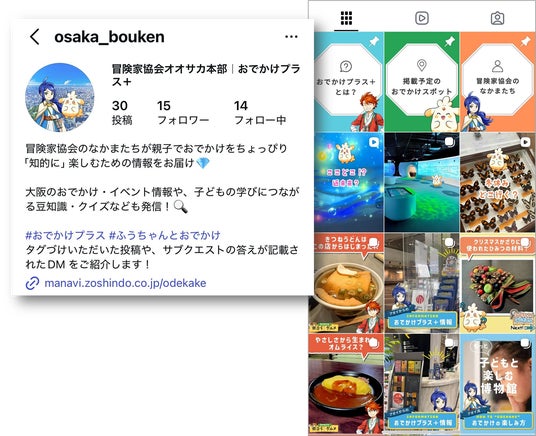 「おでかけプラス+」に登場する冒険家協会やキャラクターから、最新情報や親子でおでかけを楽しむコツ、大阪のおでかけスポット情報やグルメ情報などをお届けしています。