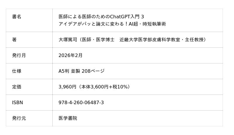 株式会社医学書院 (所在地:東京都文京区、代表取締役社長:金原 俊)は、生成AIを活用した論文作成法を医療者向けに解説する新刊『医師による医師のためのChatGPT入門3―アイデアがパッと論文に変わる!AI超・時短執筆術』(著:大塚篤司)を2026年2月に刊行しました。