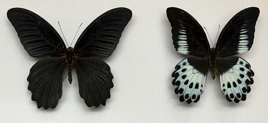 画像1.日本産ナガサキアゲハ(左)とインド産テンジクアゲハ(右)斑紋は大きく異なり、かつて別種であったが、最近の研究では遺伝的な差異がなく同種とされている。