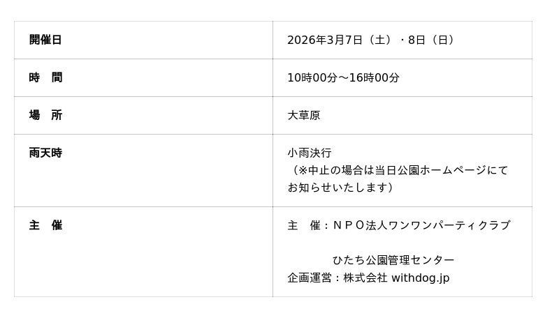 国営ひたち海浜公園では、2026年3月7日(土)・8日(日)に 「Sippo Festa 2026春(しっぽフェスタ)」 を草原エリアにて開催いたします。当公園で愛犬をテーマとした大型イベントを開催するのは、今回が初めてとなります。広大な草原のロケーションを活かした開放感あふれる会場では、多彩なショップや体験型プログラムが出店予定です。愛犬とご家族がともに笑顔になれる、特別な2日間をお楽しみください。