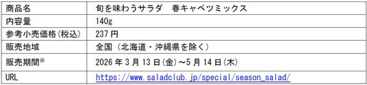 株式会社サラダクラブ(代表取締役社長:新谷昭人、本社:東京都調布市)は、春キャベツを使用した「旬を味わうサラダ 春キャベツミックス」(140g/税込237円)を2026年3月13日(金)~5月14日(木)までの期間限定で販売します。