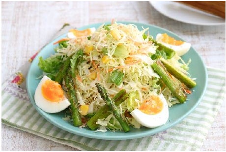 シャキシャキのキャベツとレタスに甘いコーンがアクセントのサラダに、香ばしく炒めた旬のアスパラとゆで卵を添えた、目にも鮮やかな一皿です。食卓がパッと明るくなる春らしいごちそうサラダです。