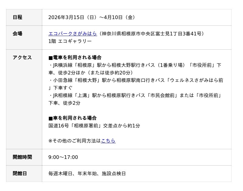 施設1階のエコギャラリーでは、第22回コンテストの優秀作品10点を展示します。世界中の子どもたちが自然や生きものをしっかりと見つめ、真剣な思いを込めて描いた作品は、どれも魅力あふれるものばかりです。また、国や地域、年齢、表現方法など、作品一つひとつに個性が光ります。会場となるエコパークさがみはら(神奈川県相模原市)では、相模原市の自然環境保全・環境教育に貢献することを目的に、学習講座や親子で楽しめるイベントの開催など環境に関するさまざまな事業を実施しています。