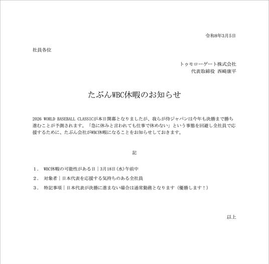 日本代表の決勝進出が決まったら実施される「たぶんWBC休暇」の社内通知