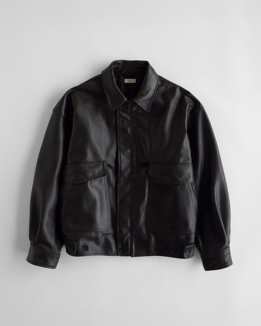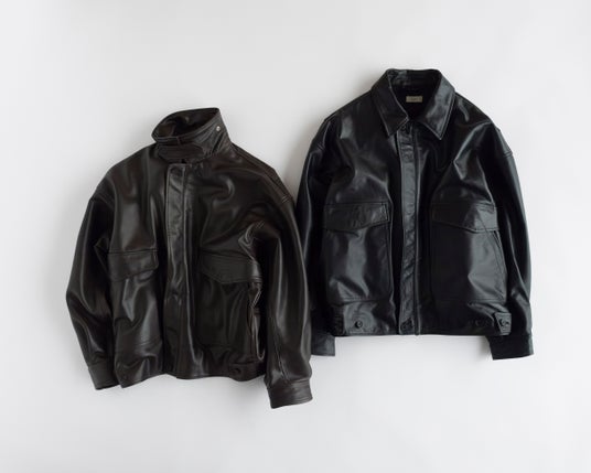 25FWで展開されたYOKEのFlight Jacketをベースに、KEY TIMEZのために制作された別注モデル。 素材は厚手のカウレザーから、柔らかさと耐久性を兼ね備えたベビーカーフレザーへ変更。フロントにはイタリアのRaccagni社製ジップを採用しています。 デザインはA-2フライトジャケットをベースに、リブを排した共地仕様でミニマルに再構築。裾のアジャストタブやアクションプリーツ、着脱可能なチンタブなどのディテールを備えた一着です。