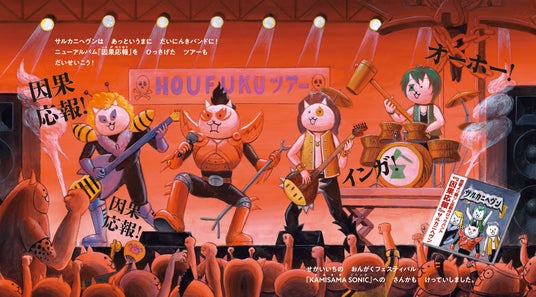 あらすじ天才子役のネコとサルは、ある日けんかをしてしまいました。ネコが「これからは音楽にゃ」と言いだし、怒ったサルが、柿をなげつけてしまったのです。やがて、ネコはヘヴィメタルバンド「サルカニヘヴン」で、甲殻の絶叫王(スクリームキング)のKANIとして大活躍。でも、それも長くはつづかず……?