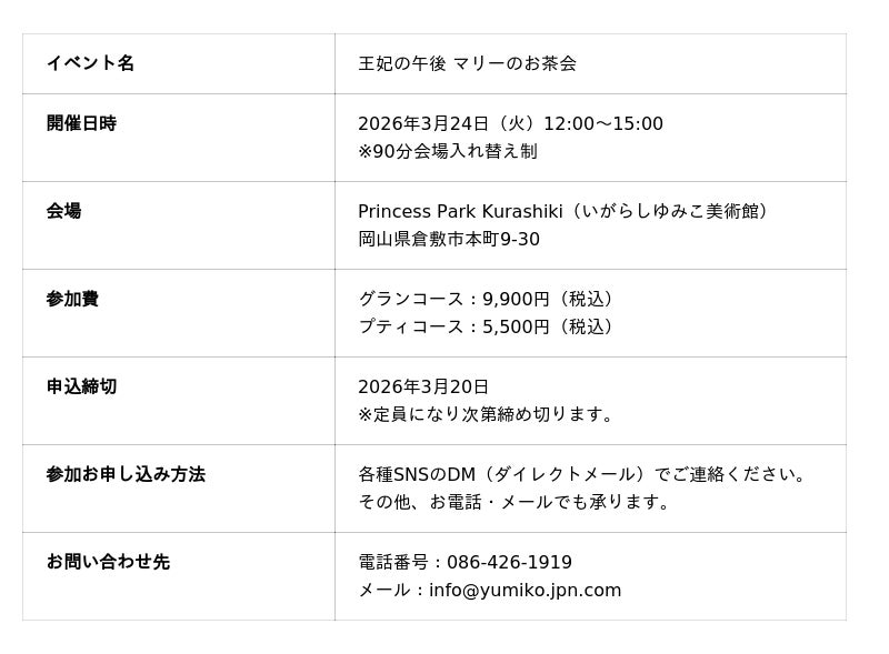 2026年3月24日には、国際的な衣装デザイン賞を受賞した三城誠子プロデュースによる、和洋折衷のアフタヌーンティーイベント「王妃の午後 マリーのお茶会」を開催。地元の銘茶やドレス体験が融合した、新たな倉敷観光の形を提案します。