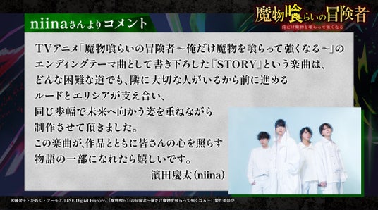 株式会社イマジカインフォス(本社:東京都 代表取締役社長:前田起也、以下イマジカインフォス)は、大日本印刷株式会社(本社:東京都 代表取締役社長:北島義⻫、以下、DNP)との共同事業「AnimationID」の第6弾作品、『魔物喰らいの冒険者~俺だけ魔物を喰らって強くなる~』(「LINEマンガ」連載)の放送情報およびED情報を公開いたします。