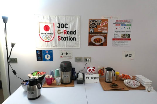 リオ2016オリンピックから6大会連続で栄養サポート拠点「JOC G-Road Station」に全面協力。選手村の食事を補完するために、近隣で通いやすい立地に拠点を作り、選手たちの“からだとこころ”に必要な栄養素を摂り続けられる施設として、日頃食べなれた「和軽食」を提供し、現地での良好なコンディション維持と栄養面(エネルギー補給等)のサポートを行いました。【提供メニュー:国産白米、具沢山汁物、主菜・副菜(パウチ惣菜)、納豆、梅干し、だし、インスタントコーヒー、ミラノエリアでのみ三日に一度スペシャルメニュー提供(後述)】