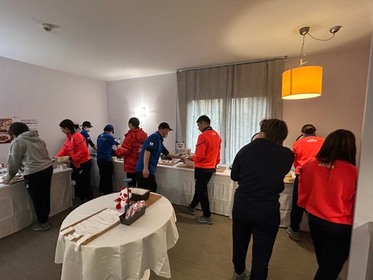 練習拠点であるヴァレーゼでの食事・補食サポートと、団体戦直前の決起集会を企画・運営いたしました。冷え込むリンクで人気があったのは「だし湯」。お湯に「ほんだし(R)」を溶かしたシンプルなものですが、かつおの風味が感じられ、「染みる...」という声も。決起集会では「Power Gyoza DON」や、坂本選手らから要望のあったティラミスを提供。満足感を残しながらも1個あたりのエネルギーを100kcal以下に抑える設計にし、これまで積み重ねてきた努力を労ってほしい―そんな思いを込めて、「ごほう美ティラミス」と名付けました。からだもこころも栄養で満たされ一致団結できるよう、サポートいたしました。