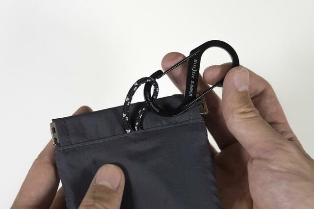 上部にループが付いているのでこちらにカラビナを装着すれば。