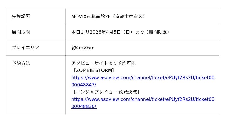 『ニンジャブレイカー 妖魔決戦』VRゴーグルをつけた瞬間、あなたは忍者になります。目の前に現れる妖魔に手裏剣を放ち、仲間と連携しながら戦い抜く。「行くぞ!」「後ろ!」「今だ!」仲間と叫び合いながら、京都の映画館で本物の忍者体験ができます。東京ドームと共同開発した忍者アクションXRの最新作です。料金:1,500円