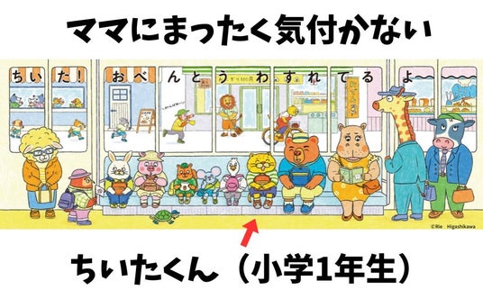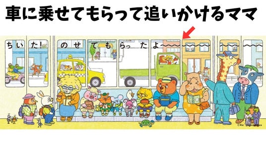 何とか気付いてもらおうとしているママと、応援する動物たち。そんな窓の外の様子に全く気付かず平和に遠足を楽しんでいる電車内とのギャップがまた面白い!