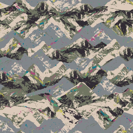 雄大な山々を背景に、カラフルなフラッグや装飾が揺れる昼のフジロックをイメージ。