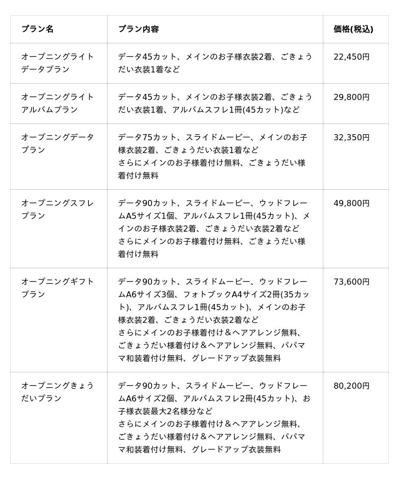 この度のオープンを記念し、特典付きの6種類のパッケージプランとイベントをご用意しました。バースデー、七五三、お宮参り、入園・卒園などシーンを問わずご利用ください。