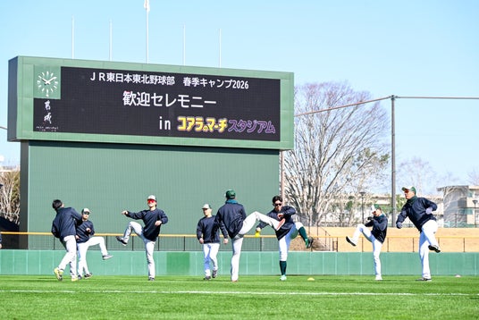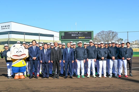 3月4日(水)から、都城コアラのマーチスタジアムでJR東日本東北野球部が春季キャンプをスタートしました。歓迎セレモニーでは、市や県、市の観光協会、市内協賛企業などから、宮崎牛や宮崎ブランドポークなどの地場産品をチームに贈呈するとともに、池田市長が激励の挨拶を行いました。