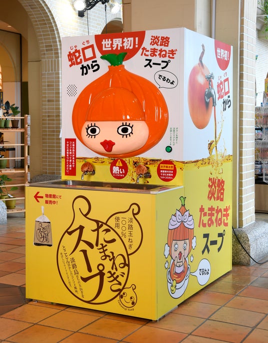 ■淡路たまねぎスープスタンド(スイッチを押すと淡路タマ子がおしゃべり!?)2つの蛇口から注がれる100%淡路島産の玉ねぎを使用したスープは、コンソメ味。機器の外観イメージは、淡路ハイウェイオアシスのゆるキャラ「淡路タマ子さん」を立体的に再現しています。スイッチを押すとお話しする、おもしろ機能を搭載しております。