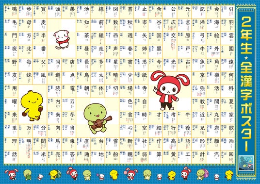 ポスターはB3サイズの超特大版。表面には小学1年生で習う全漢字を、裏面には小学2年生で習う全漢字を掲載しています。ポスターを使えば、お子さまのやる気がアップすること間違いなし!