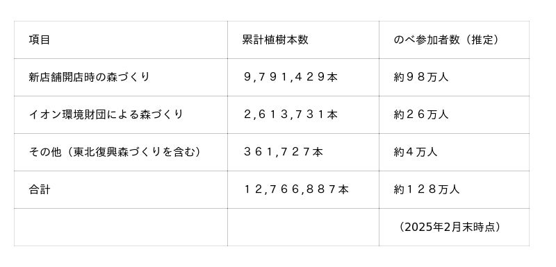 その土地本来の樹木の苗木を種々とりまぜて植え、競い合うように成長させる手法に基づき、2025年2月末時点で、累計植樹本数は約1,276万本、参加者数はのべ約128万人(推定)に達し、全国各地で豊かな森に包まれたショッピングセンターが続々と誕生しています。