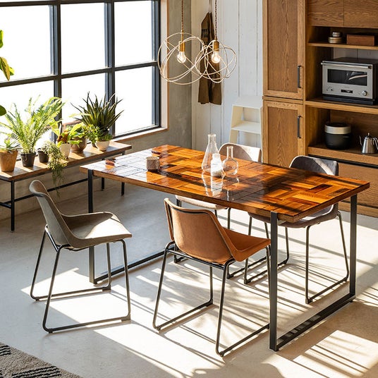 テーブル天板は、「ヘリンボーン柄」「チェス柄」「OSB」「ステンレス」の4つをラインナップ。独特の味わいのある古材や木片の模様が個性的なOSB、無機質なステンレスなど、素材それぞれの質感を強く感じるように仕上げています。