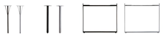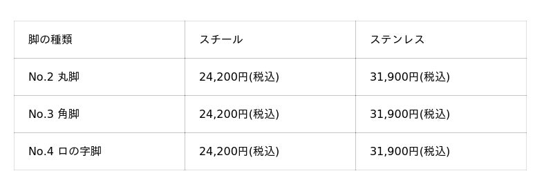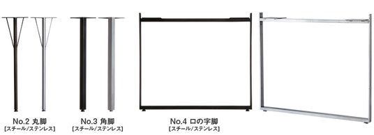 テーブル脚は、3つのデザイン(No.2:丸脚/No.3:角脚/No.4:ロの字脚)にそれぞれ、スチール(ブラック)またはステンレスの2色で合計6種類をラインナップしています。