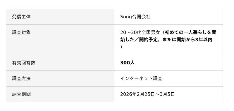 Song合同会社は、初めての一人暮らしを開始した、または開始予定の20~30代男女を対象に「持たない家電と節約効果」に関する調査を実施しました。 一人暮らし開始時に買わなかった家電、その理由、実際に生活してから感じた不便さや節約効果などを調査しています。