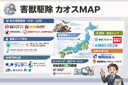 リフォーム会社「合同会社リノベモ」(本社:埼玉県川口市)は、害獣駆除業界の現状を視覚的に把握できる「害獣駆除サービス カオスマップ」を公開しました。本カオスマップは、害獣の駆除や対策を検討する消費者にとって最適な業者やサービスを見つけやすくするために作成されました。
