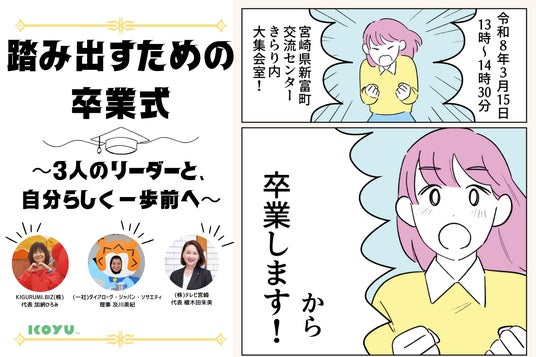 宮崎県新富町を拠点に地域づくりを推進する、一般財団法人こゆ地域づくり推進機構(以下:こゆ財団、所在地:宮崎県児湯郡、代表理事:岡本啓二)は、人生やキャリアの節目に立つ方々が「自分らしい一歩」を踏み出すきっかけを創出するイベント『踏み出すための卒業式 ~3人のリーダーと、自分らしく一歩前へ~』 を、2026年3月15日(日)に開催することをお知らせします。