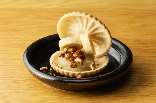 佐藤商店のバナナ最中食後のデザートには、千葉県館山市で90年以上バナナを専門に扱う老舗のバナナ専門店・佐藤商店で熟成されたバナナを使用した自家製の最中を提供いたします。独自の技術で追熟されたエクアドル産バナナとキャラメリゼしたくるみと白あんを一口サイズの最中でサンド。バナナのやさしい甘みとくるみのほろ苦さ、白あんのまろやかさが味わえるデザートです。