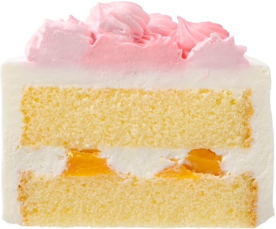 お花見ショート:苺風味スポンジ&抹茶スポンジで黄桃入りホイップクリームをサンドしたケーキ