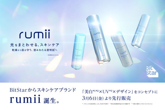 インフルエンサーマーケティングプラットフォームを中心とした複数の事業を展開する株式会社BitStar(本社:東京都渋谷区、代表取締役 社長執行役員CEO:渡邉拓)は、スキンケアブランド『rumii(ルーミ―)』を2026年3月6日(金)より全国のツルハグループ、ドン・キホーテ、アインズ&トルペ、他バラエティショップで先行発売することをお知らせいたします。