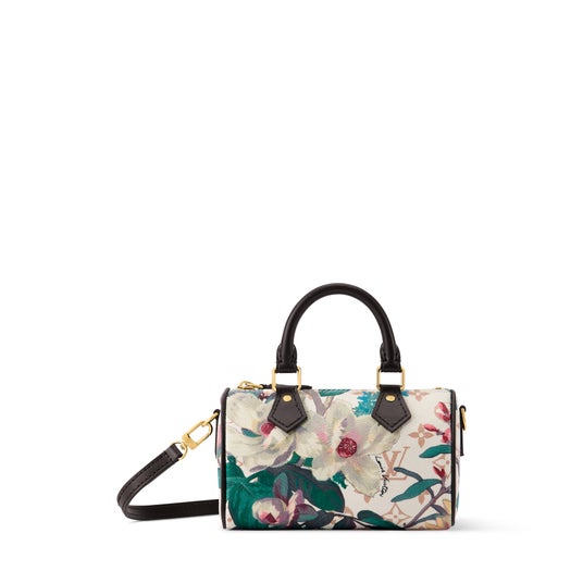 季節感のある動植物のデザインがあしらわれたバッグ「ナノ・スピーディ」。メゾンを象徴するモノグラム・パターンで彩られたキャンバスを使用し、ハンドルとストラップにはスムースレザーのトリミングを施しました。内装には毎日の必需品を収納できる広々としたスペースを備えています。